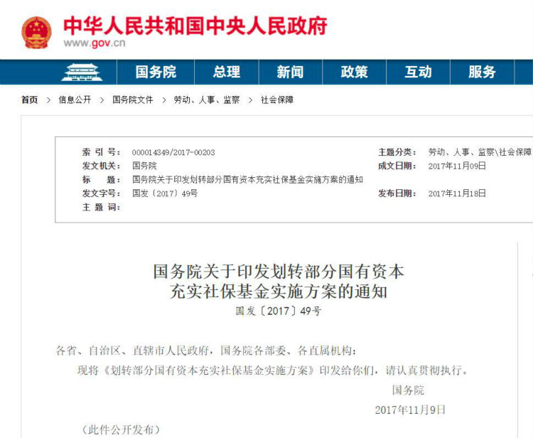 11月18日,国务院印发《划转部分国有资本充实社保基金实施方案》指出,为充分体现代际公平和国有企业发展成果全民共享,现决定划转部分国有资本充实社保基金。